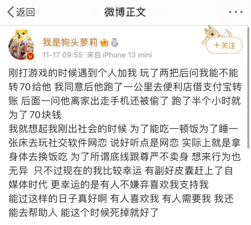 早在前一天狗头萝莉就帮助一位离家出走手机被偷的人,甚至感慨刚出社会为了一顿饭、睡一张床、去玩网恋,实际就是用身体换饭吃。