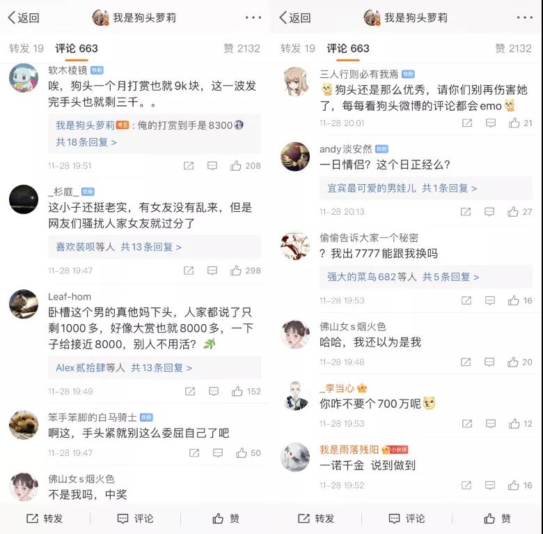 有粉丝直言人家“狗头萝莉”都只剩下1000多块了,还让她怎么活啊。
