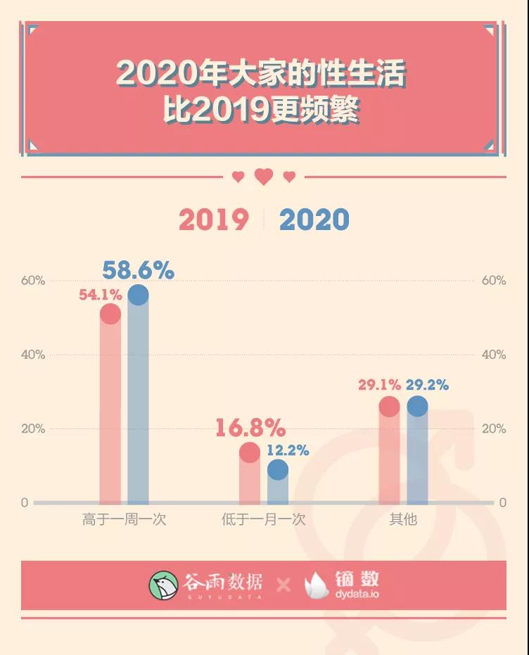 对比2019年谷雨数据的调查数据,我们发现,2020年至今,大家的性生活比2019更频繁。