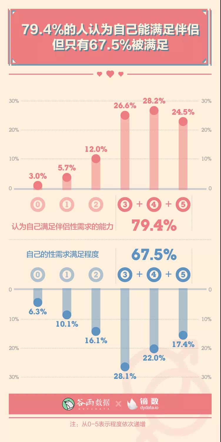 我们调查的结果显示,79.4%的人认为自己满足伴侣性需求的能力在3分以上(满分5分),但只有67.5%的人认为自己的性需求得到了满足。