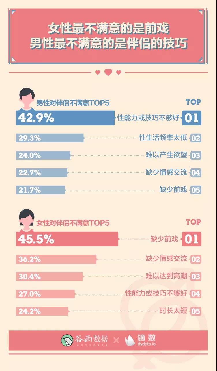 在对伴侣不满意的各项原因里,让女性最不满意的是“缺少前戏”,让男性最不满意的是“性能力或技巧不够好”。