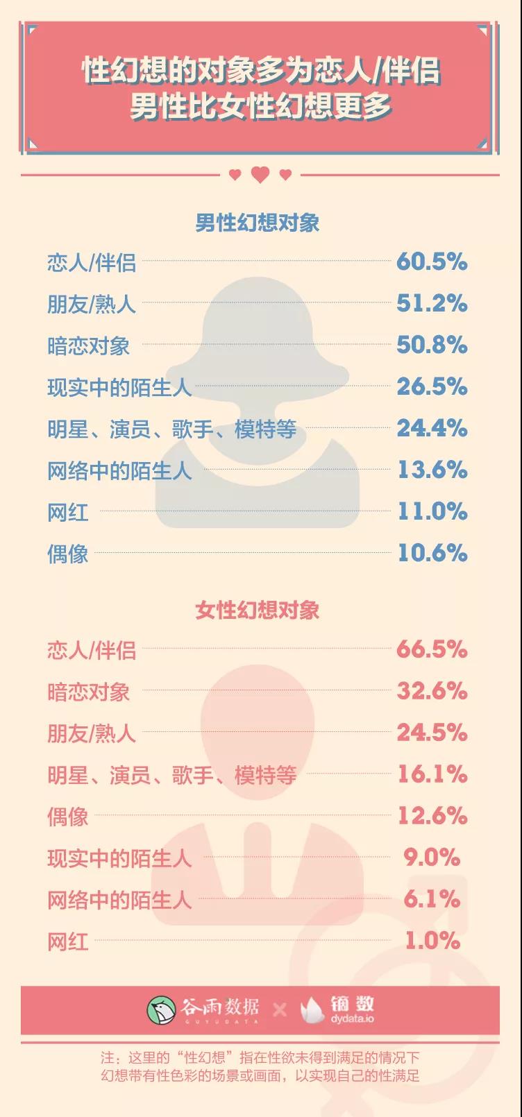 虽然不分男女,排名前三的性幻想对象都是:恋人/伴侣、暗恋对象、朋友/熟人,但男性的性幻想对象明显更加多元,女性则相对集中。