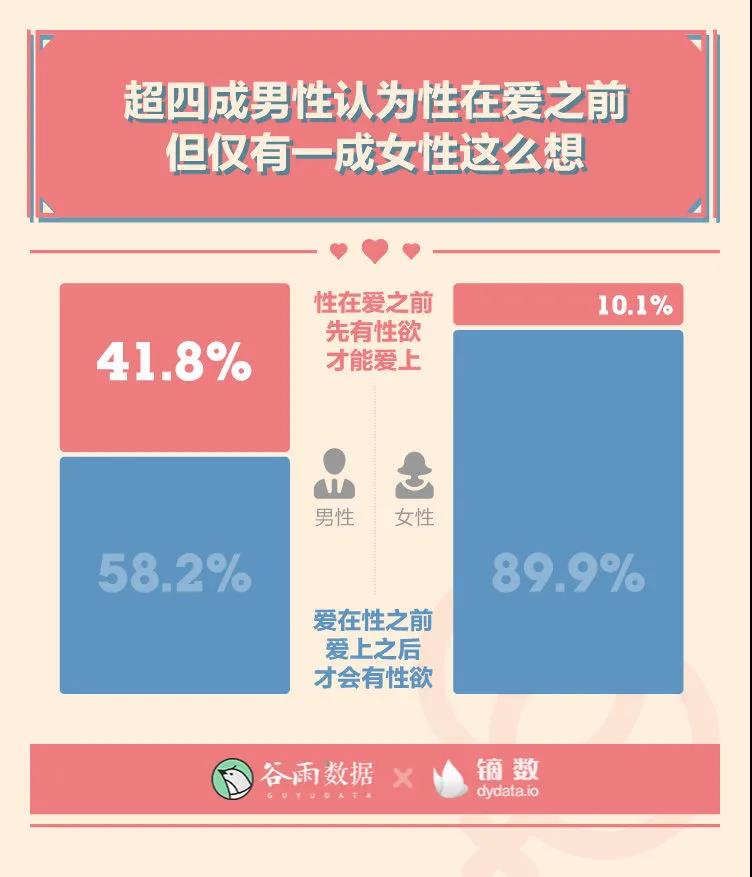 41.8%男性把性摆在爱之前,认为先有性欲才能爱上。相比之下只有10.1%女性这样认为。