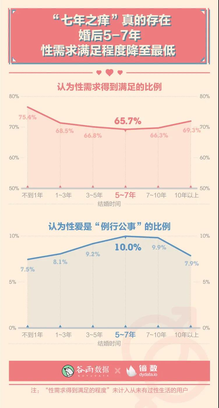 “七年之痒”真的存在,甚至可能来得更早一些。在所有婚恋状态中,婚后5-7年,性需求满足程度降至最低,认为性爱是“例行公事”的比例达到最高。
