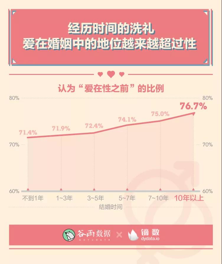 在所有结婚时间段中,结婚10年以上的人认为“爱在性之前”的比例达到最高,为76.7%。