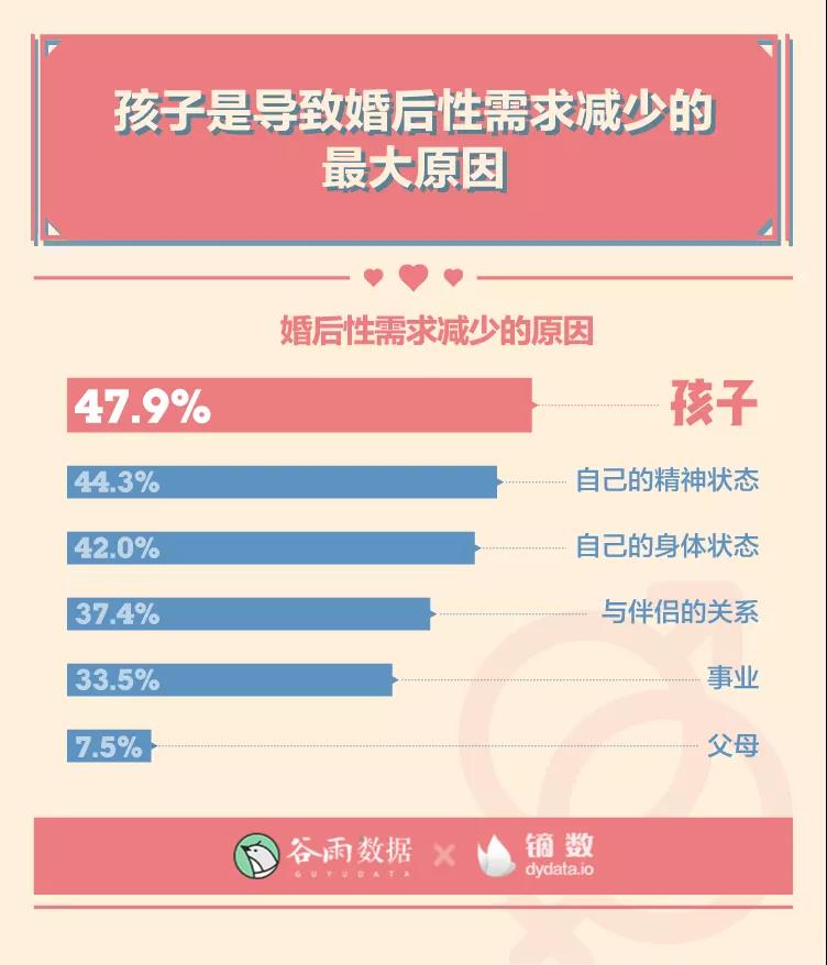 我们的调查显示,在所有导致婚后性需求减少的原因中,“孩子”超越了“精神状态”、“身体状态”、“伴侣关系”等,成为性生活的“头号杀手”。