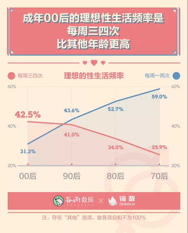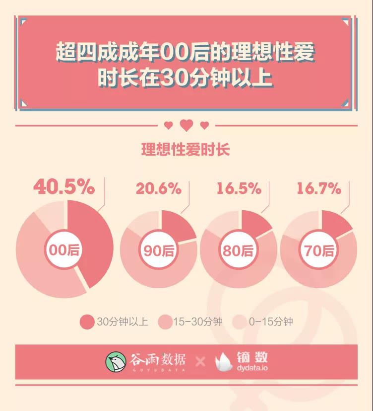 年轻的身体里装着更加旺盛的性需求。超四成的成年00后理想性生活频率是每周三四次,理想性爱时长在30分钟以上,这两个比例都比其他年龄更高。