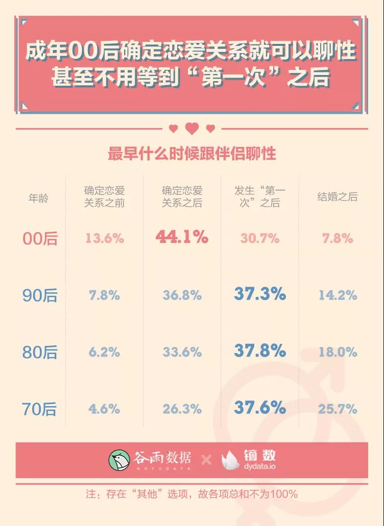 在性表达方面,00后的开放程度的确也更高。44.1%的成年00后认为确定恋爱关系就可以聊性,而其他年龄段更倾向认为要等到发生“第一次”之后。