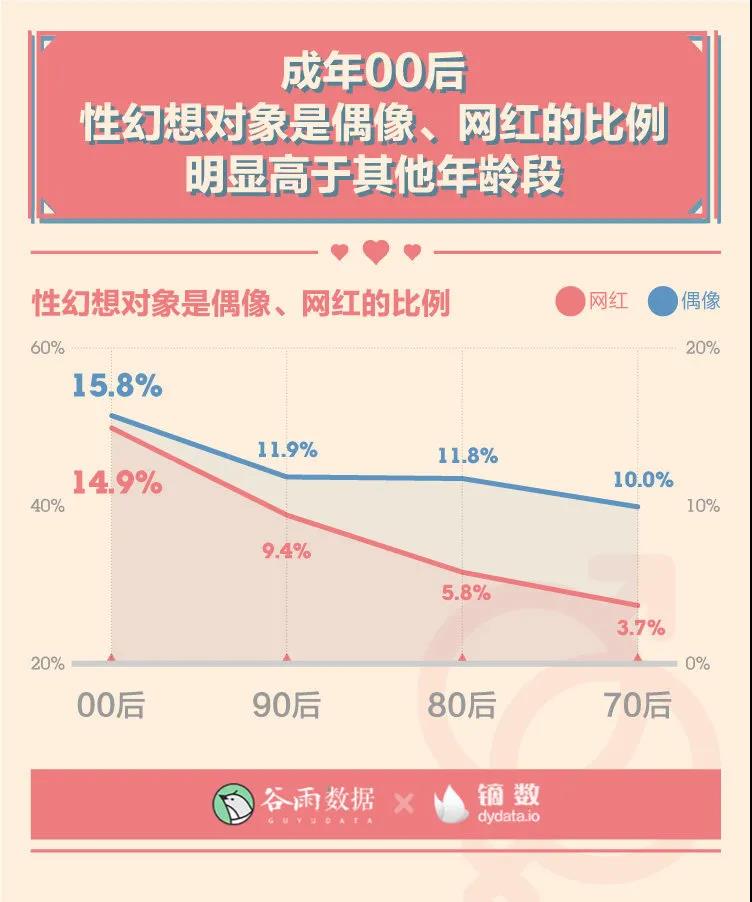 另外,作为网络时代的“土著”,成年00后们性幻想对象是偶像、网红的比例也明显高于其他年龄段。