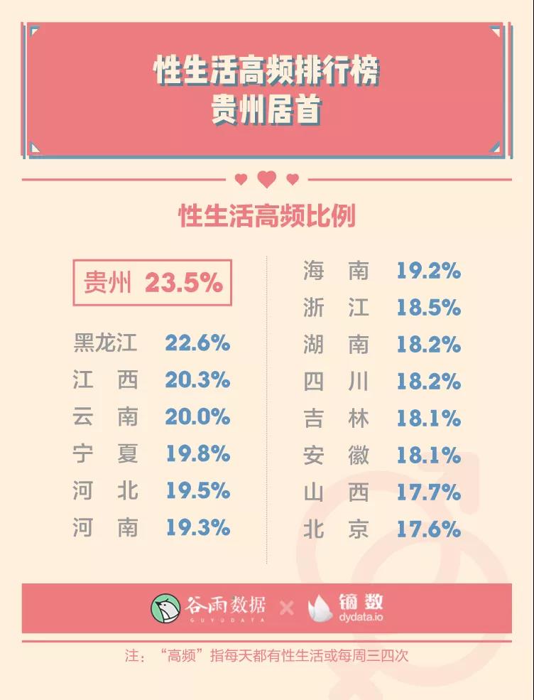 在谷雨数据2019年的调查中,贵州省56.1%的人每周都有性生活,这一比例高居各地区榜首,而今年……性生活频率排行榜中,贵州人民再次荣登榜首。