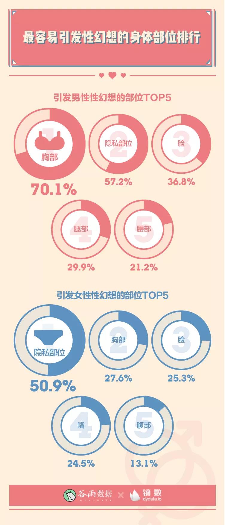 三大身体诱惑:男人眼里的胸(70.1%)、男人眼里的“隐私部位”、(57.2%)女人眼里的“隐私部位”(50.9%)。这三者在所有引发性幻想的身体部位中得票最高。