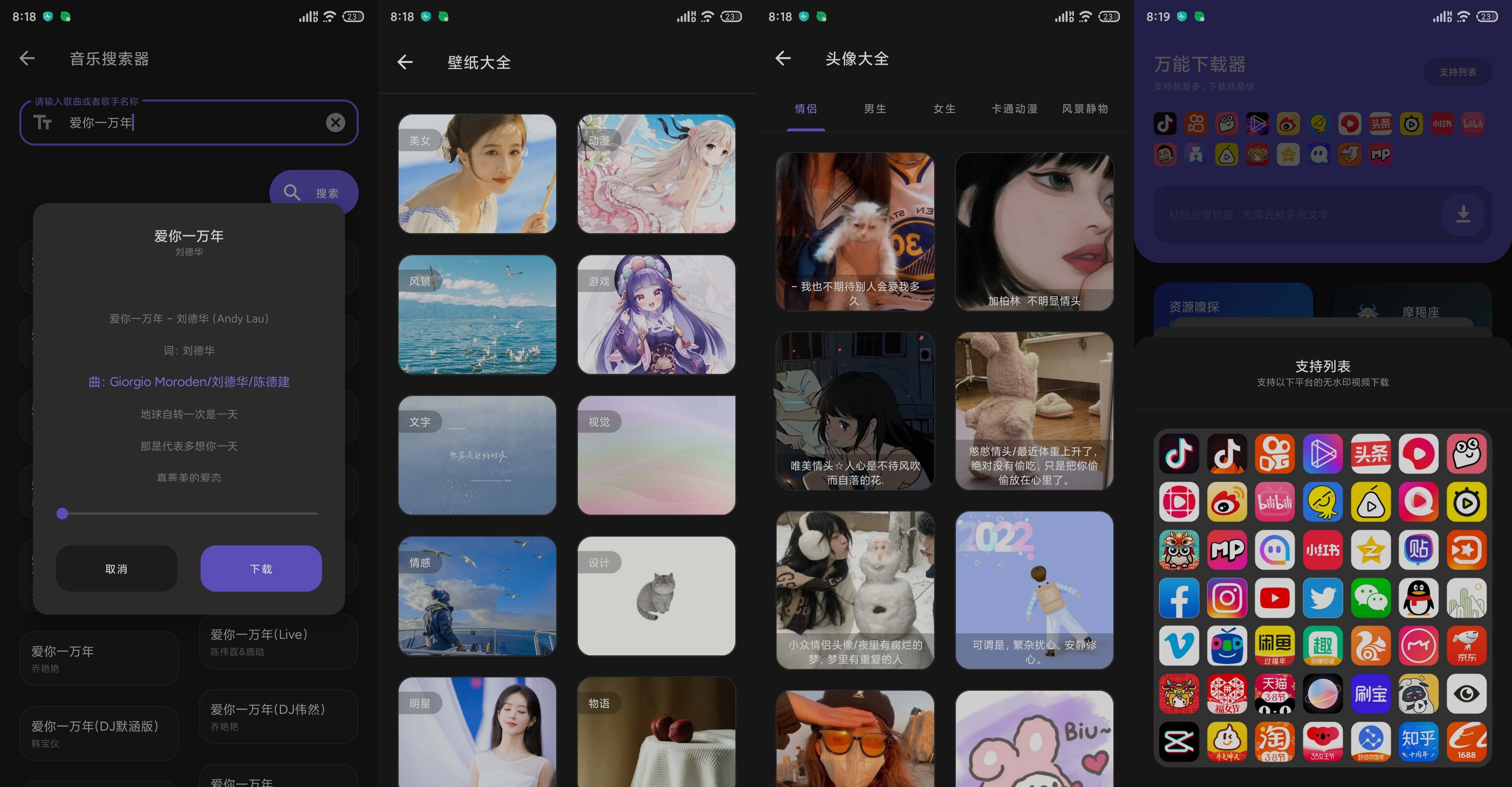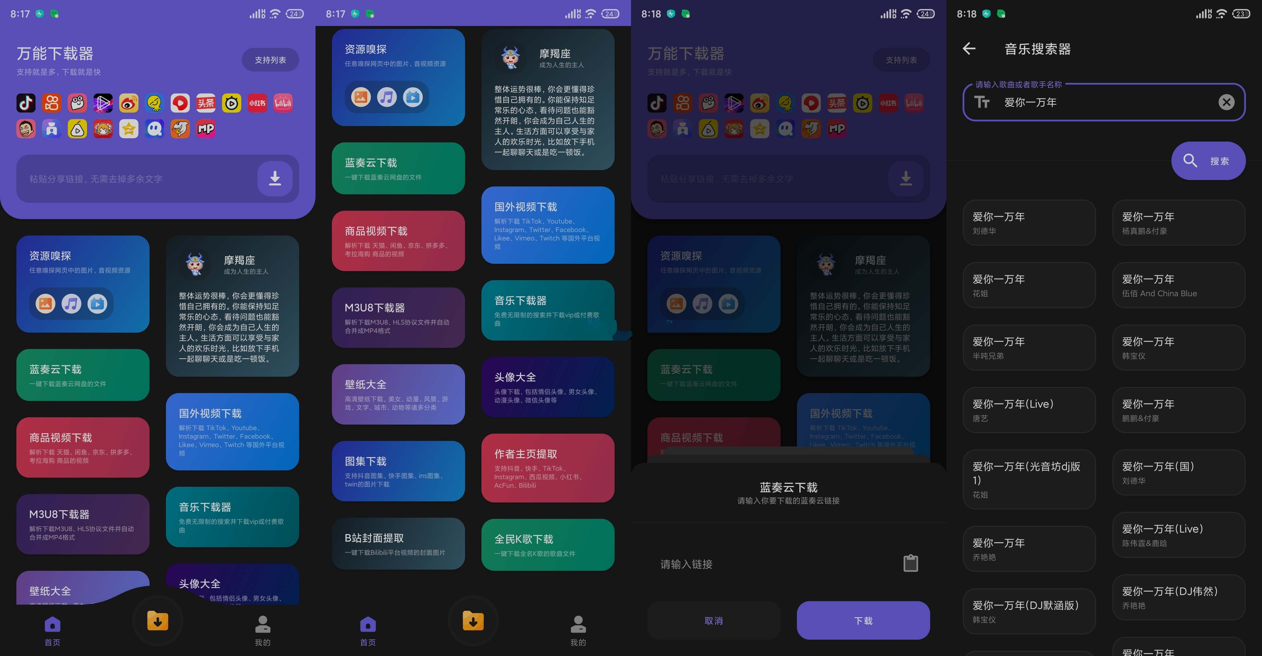 万能下载器(包名:com.wan.tools)是一款支持无水印下载抖音、快手、头条、哔哩哔哩等几十个平台短视频的软件;可嗅探下载网页视频,M3U8下载;解析淘宝京东等多平台商品视频,免费下载音乐、壁纸、头像。