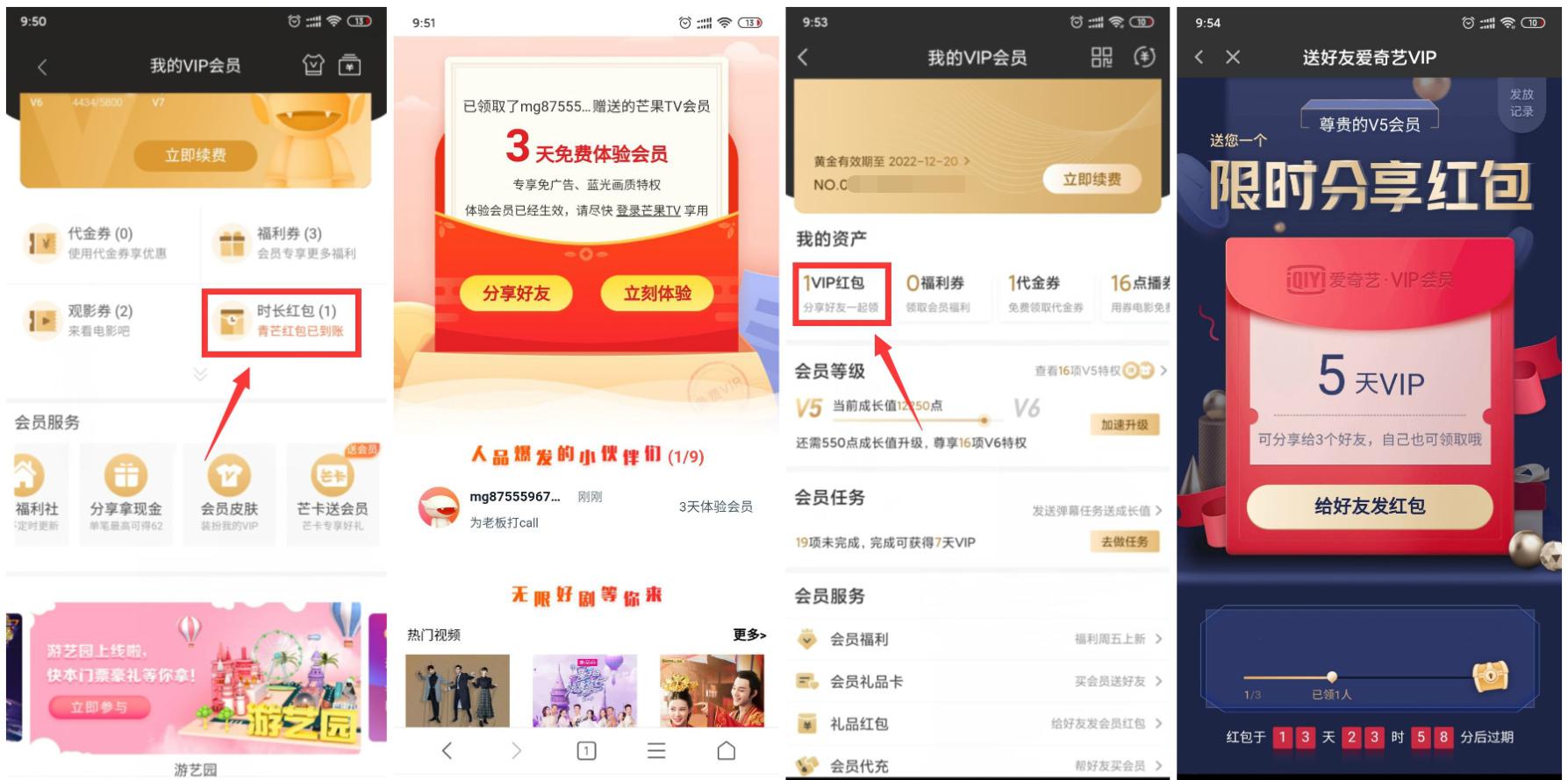 手机芒果TV->我的->VIP会员->时长红包->青芒红包->分享连接->可自己或别人领取