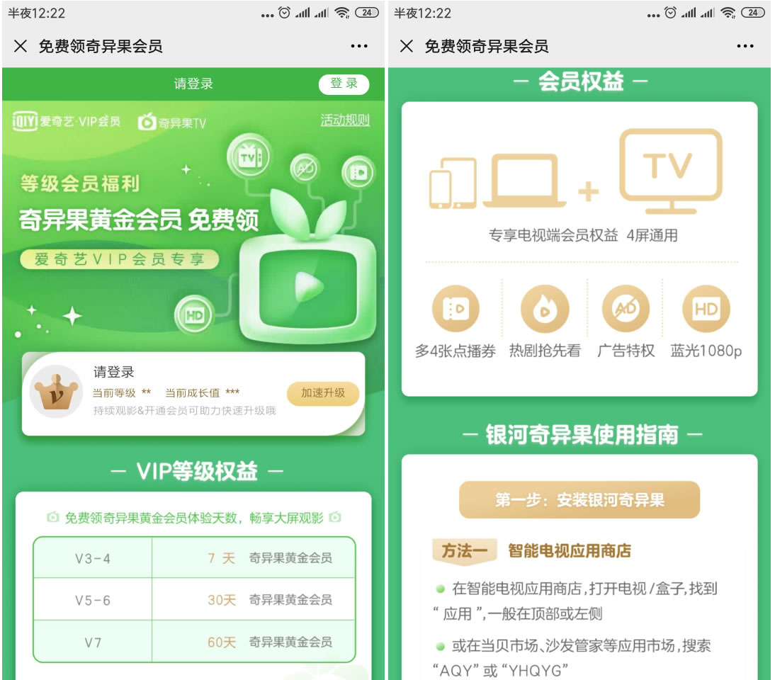 微信扫码 参加 爱奇艺会员等级领福利活动;本次针对 爱奇艺VIP会员对应等级 可领取 7-60天 奇异果黄金会员,奇异果会员 比爱奇艺vip会员还牛逼,电视TV端、手机端、笔记本、平板端 4屏通用。活动奖励: