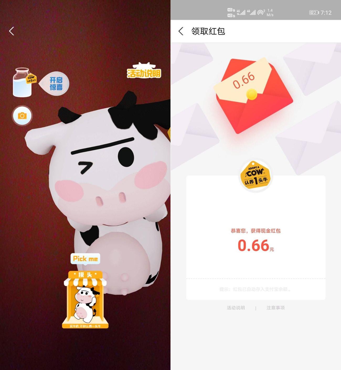 支付宝->扫码->选择AR->对着第一张图片扫码->点击召唤->点击奶牛->再点左上角开启惊喜->秒到随机红包