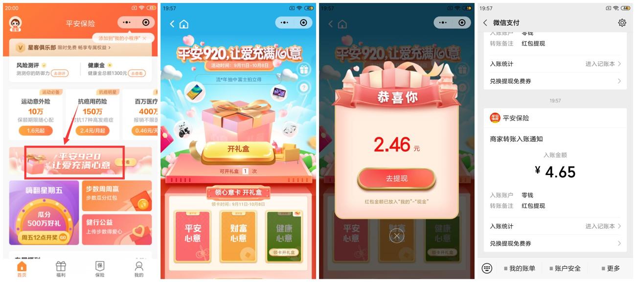 微信小程序搜索“平安保险”->首页->中间轮播图找到->“平安920 让爱充满新意”->点击卡片做小任务抽奖->然后再点击顶部礼盒抽奖->开3个卡片+开3次礼盒共6次机会(要分3天,每天抽2次)