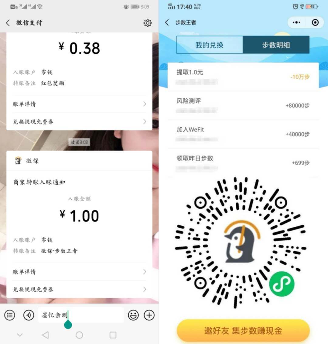 微信扫码完成图片中的三个任务—风险测评,—加入wefit —昨日步数—必中1元—这个是腾讯活动—大家请放心