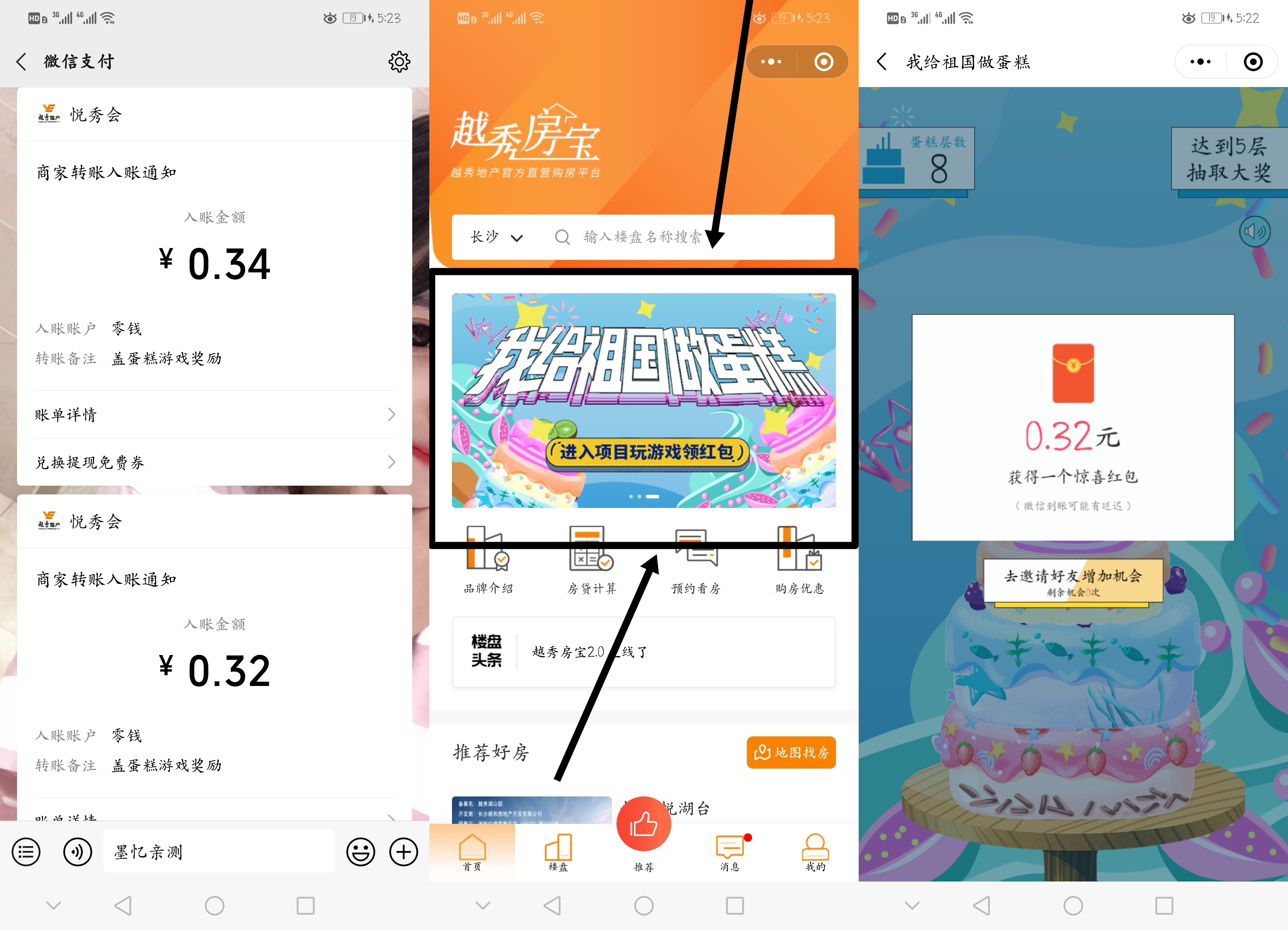 进入小程序~横幅“我给祖国做蛋糕”点进去~玩游戏五层蛋糕~抽红包~三次机会0.66亲测