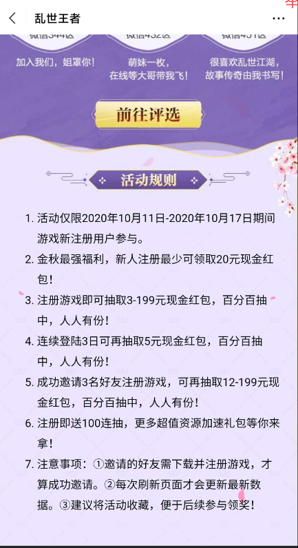 【活动时间】10月11日至10月17日【活动规则】活动期间活动页面注册领取【参加方式】微信打开链接参与https://game.weixin.qq.com/cgi-bin/actnew/newportalact/140284/qfrTxnsnCBfvWzfKX9MGZQ/main_page?key=【其他说明】【测试截图】