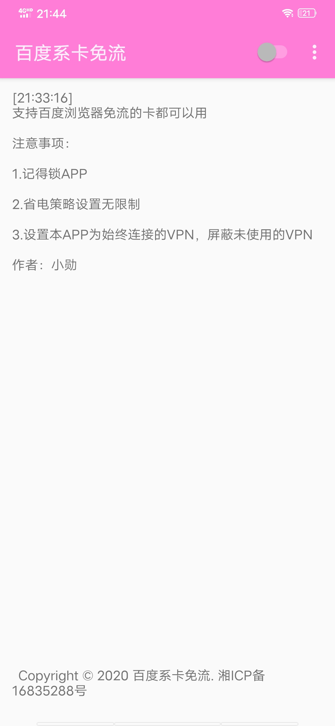 目前测试支持星卡、圣卡、歪卡,其 他百度系免流卡需自行测试