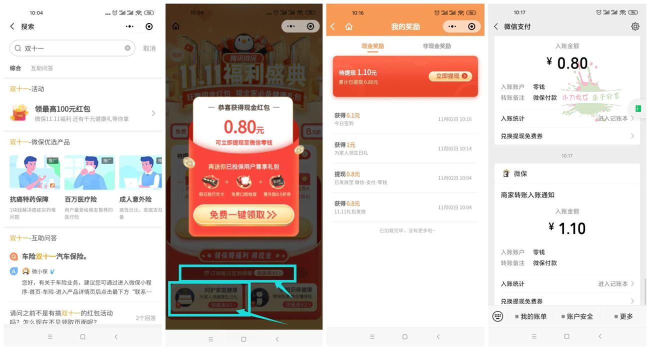 1.微信小程序搜索“微保”->首页左上角搜索->“双十一”->点击活动进入->就有弹窗领取随机红包