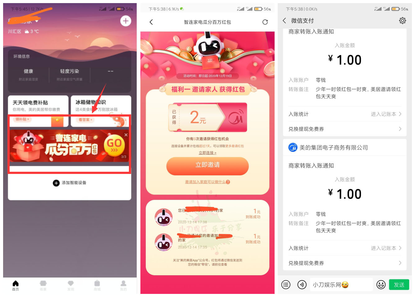 美的美居两号互撸2~7元红包