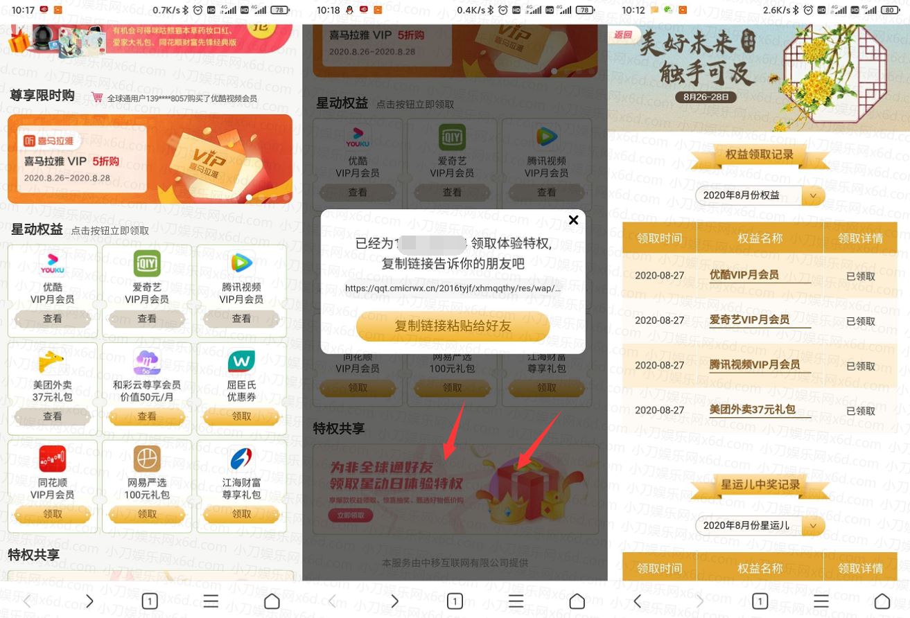如果没名额了就下个时段再来!每个能领的用户可以点底部送非全球通好友特权,他也能免费领所有会员!