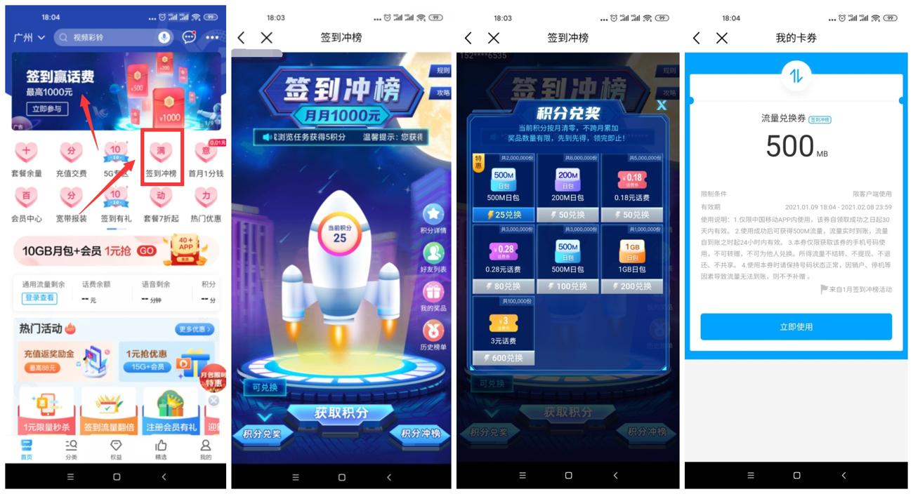 1、打开中国移动APP->首页->顶部轮播图->签到赢话费或者点签到冲榜->进去做简单的任务