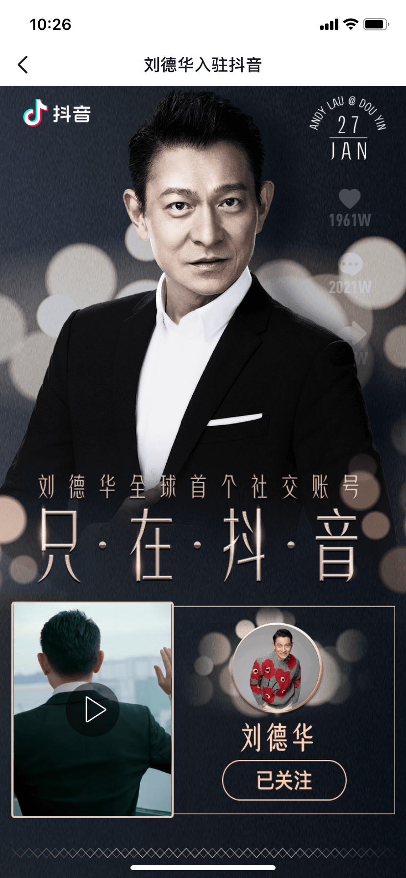 鞭牛士 1月27日消息,艺人刘德华开通了抖音账号。经鞭牛士查看,抖音首页显示,刘德华全球首个社交账号,只在抖音。截止发稿前,刘德华抖音号粉丝已超七百万,发布了一条短视频已获赞超过五百万。粉饰破2千万+。