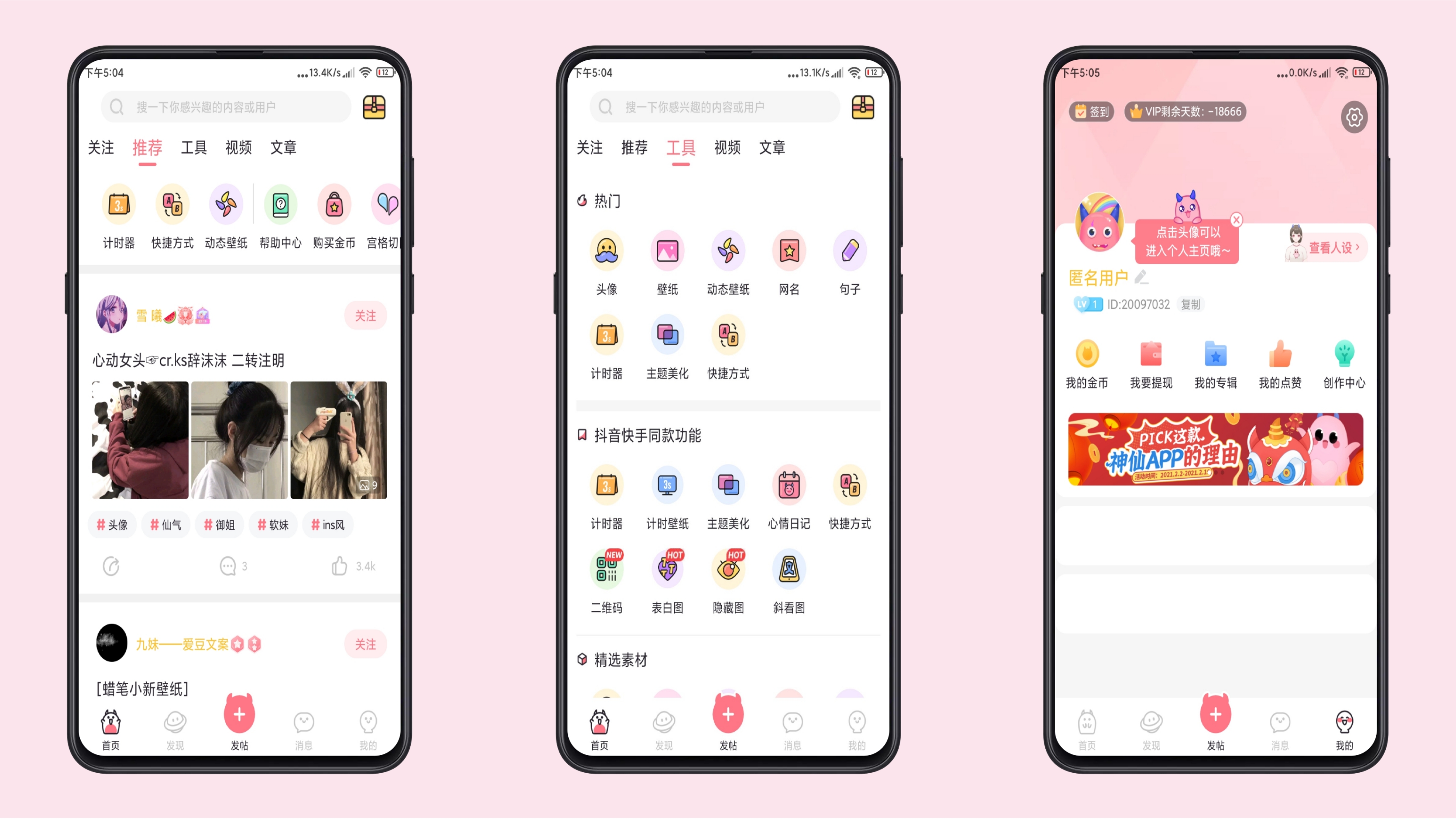 一款非常好用的多功能软件,内置大量关于美化的小工具!玩机、找图DIY做图、CQY扩列,拥有头像/壁纸等等成吨素材库!还有超多创意功能等你体验,修改永久会员,去除无用布局~