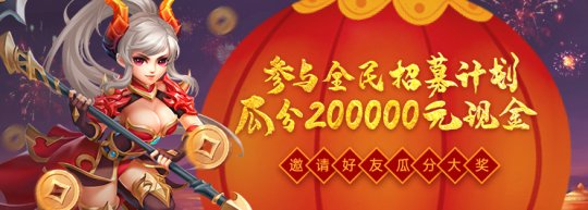 在这样一个《逍遥情缘》新服开启的喜庆日子里,我们的全民招募活动仍在持续中!通过全民招募计划邀请你的好友一起来《逍遥情缘》闯荡将会给你活动积分,这些活动积分就是瓜分20万现金的依据。你邀请的朋友越多,你就有越大的机会获得积分,那么你就能换到更多的现金或者元宝。