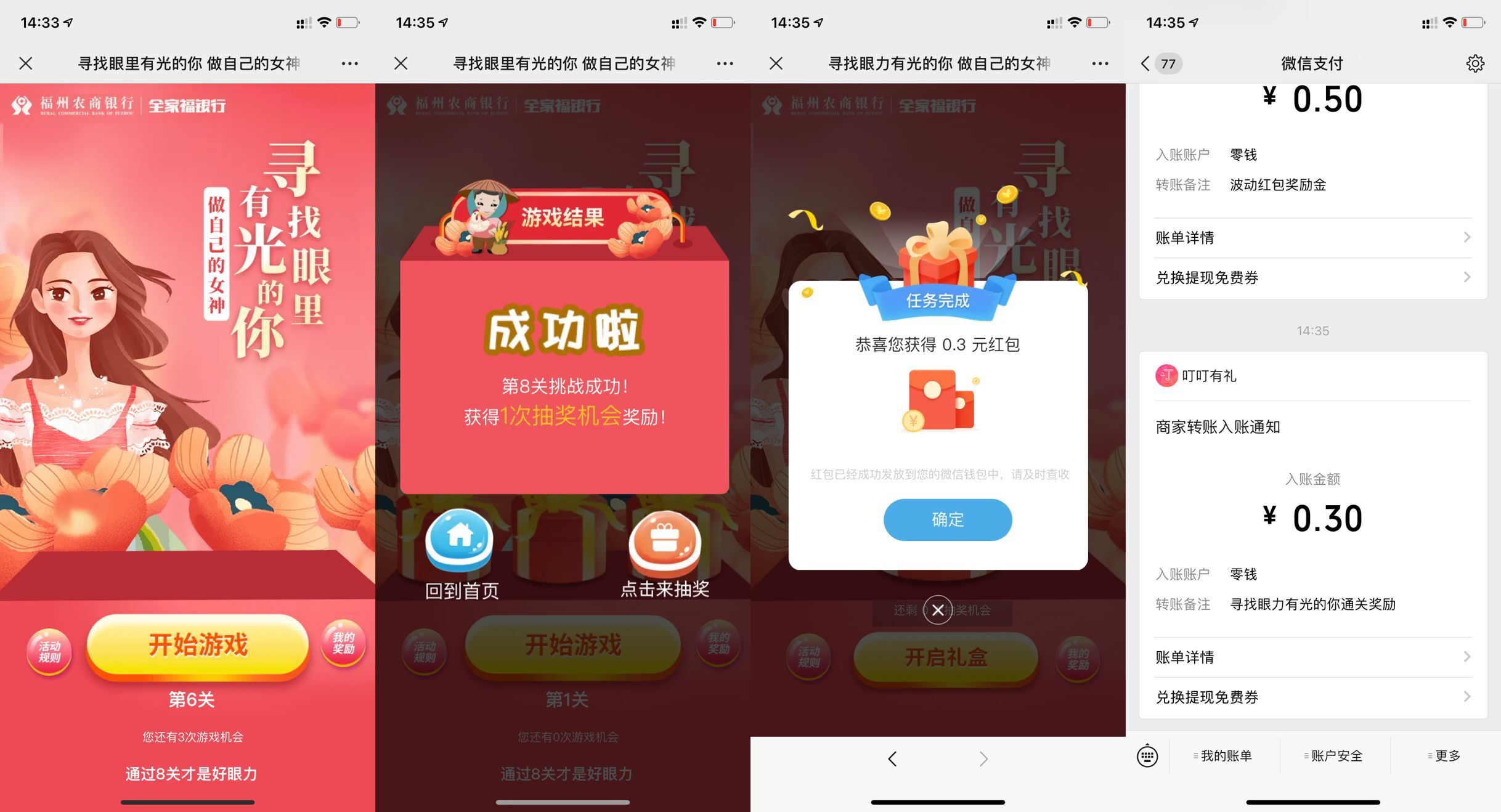 微信打开点图->考眼力玩游戏过8关->机会用完->亲测0.30元微信红包!