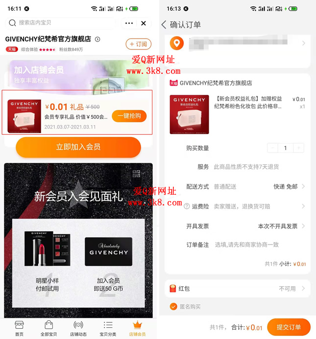 奖品数量有限,先到先得,在页面先加入会员,再去抢购下单,只需0.01元