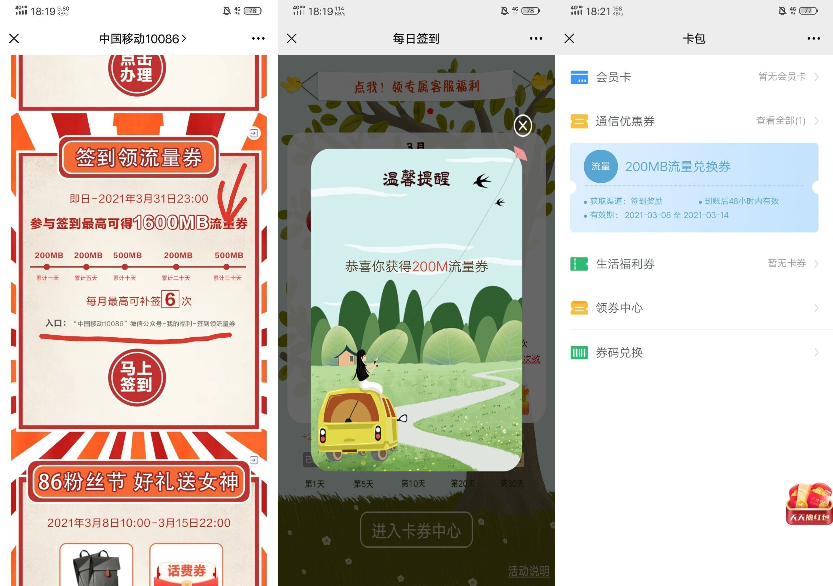 移动用户领1600M流量->微信打开下拉点签到->首次200M流量->到卡包兑换即可!