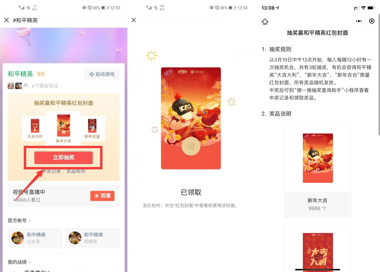微信搜索“和平精英”->进入抽3款微信红包封面!非必中