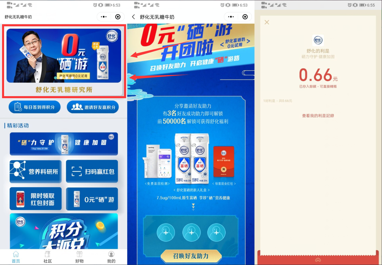 微信小程序搜索“舒化”->点首页顶部轮播图“0元硒游”->下拉页面->邀3个人助力->成功后再次进入活动手动领取0.66元->可以互助->同个号可以无限助