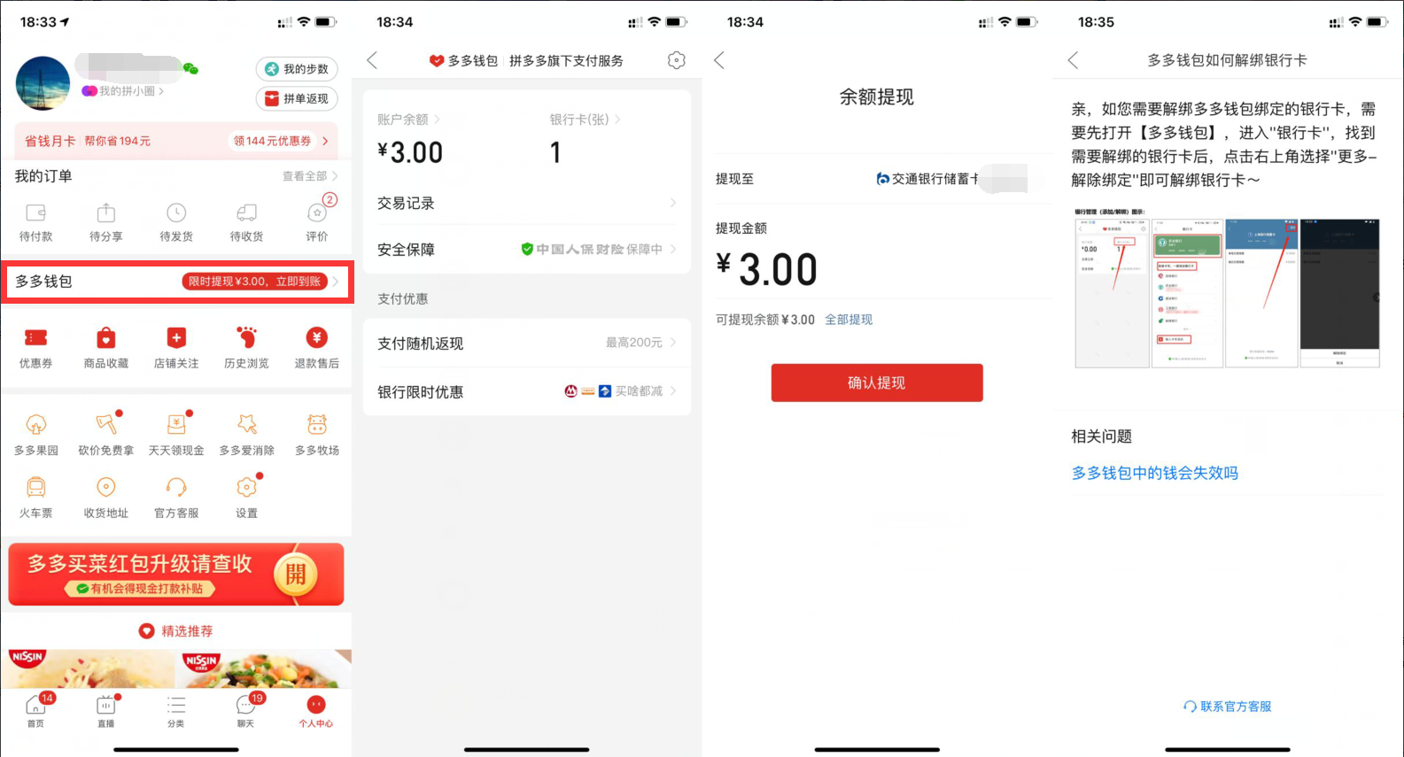 【拼多多领3元现金】各大应用市场下载“拼多多”app->右下“个人中心”->多多钱包有没有图里圈起来的的那个->有就跟据提示绑定银行卡提现即可!亲测3元秒到!到了解绑即可~