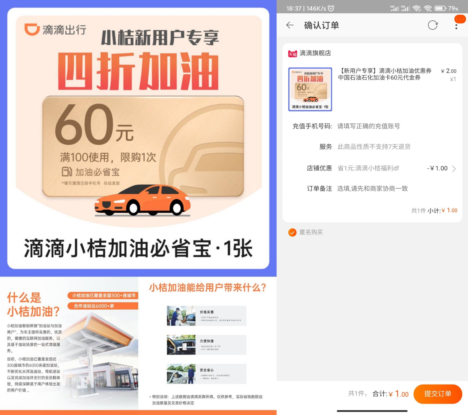 PS:1块钱撸60元加油卡,滴滴出行推出的!!