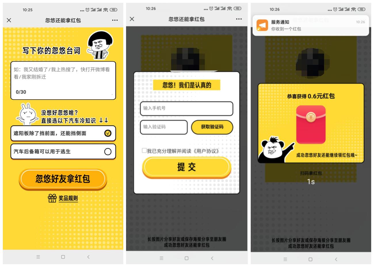 微信打开->跟着指引走->拿红包->没反应多点几下->直到输入手机号抽奖