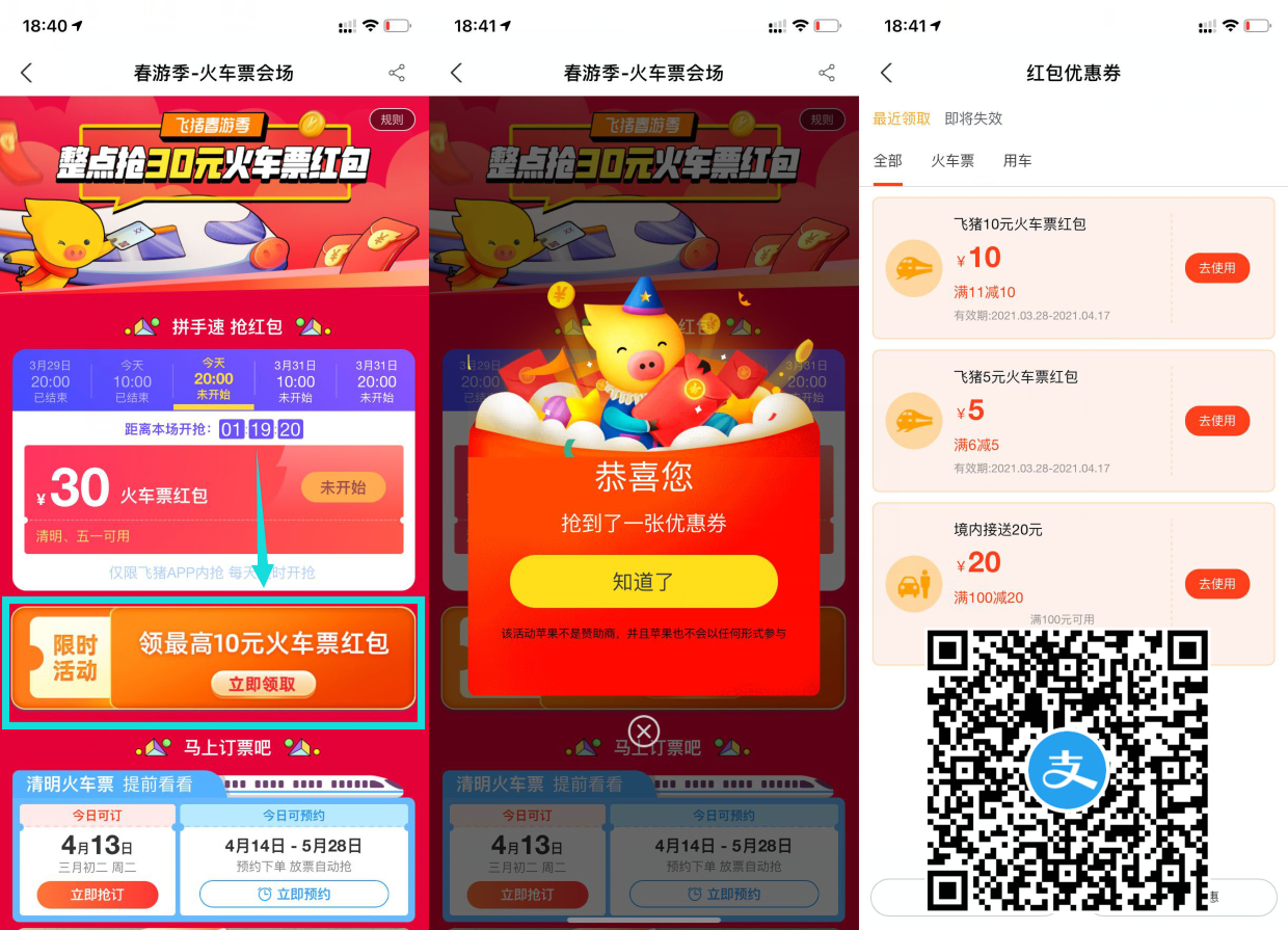 飞猪免费领10元火车红包 打开支付宝扫码参与->点限时活动->亲测11+5元券->有效期18天->另外还有3个时段可抢30元火车票券->假期要出行先领着防身!