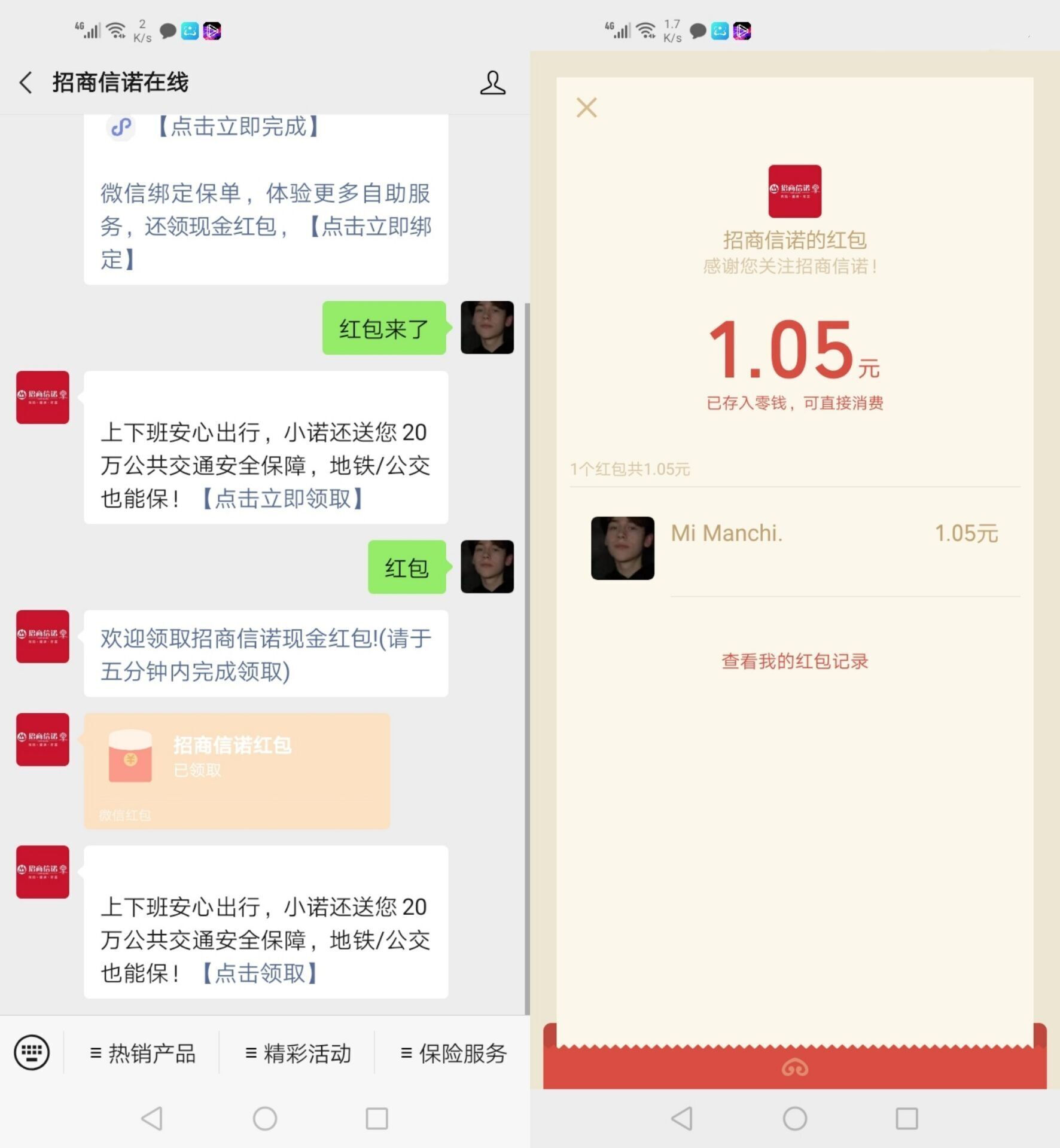 微信公众号“招商信诺在线”->回复关键词:红包168、红包来了、抢红包、红包->推文进部分老用户也可以->关注过的取关重新!亲测1元微信红包!