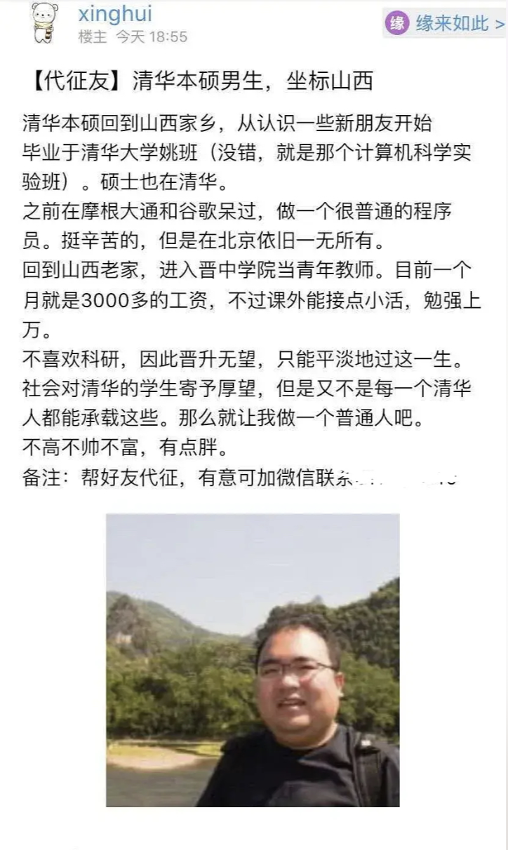彼时,他的朋友是这样介绍他的:清华大学姚班毕业,硕士也在清华,之前在摩根大通和谷歌待过,做一个很普通的程序员。回到山西老家,进入晋中学院当老师,月薪3000元。不高不帅不富,有点胖。这在网上同样引起了不小的争议。大家知道,清华大学姚班可不是一般的厉害,其全称为“清华大学计算机科学实验班”,创办于2005年,它创立的初衷就是为了筛选和培养全世界最顶级的计算机天才,所以门槛特别高。于是,有网友说,为什么一个清华毕业生甘愿选择平凡和普通?甚至有人说他是在浪费自己的才华。还有网友说,他月薪3000元,混的如此之差。也好意思找女朋友。如今一年过去了,张昆玮虽然还在家乡的二本教书,但收入增加了不少,写程序,教竞赛,现在月薪达到50000元。于是他又一次信心满满的选择了征婚。可令他措手不及的是,收入是上来了,自己却因为长相问题受到了嘲笑。有网友表示,劝一劝有些男人,不要眼光太高,不要太挑。别觉得自己读那么多书,赚几个钱就可以心高气傲挑三拣四了。别嫌弃七大姑八大姨给你介绍的相亲对象,那就是你能配得上的标准,别幻想着发帖找个更好的,太不脚踏实地了。更用网友套用前段时间很火的梗表示:就冲这个形象,你明明那么普通,怎么就那么自信?对于这样的争议,4月2日,张昆玮就内卷、身材焦虑、性别问题发文。