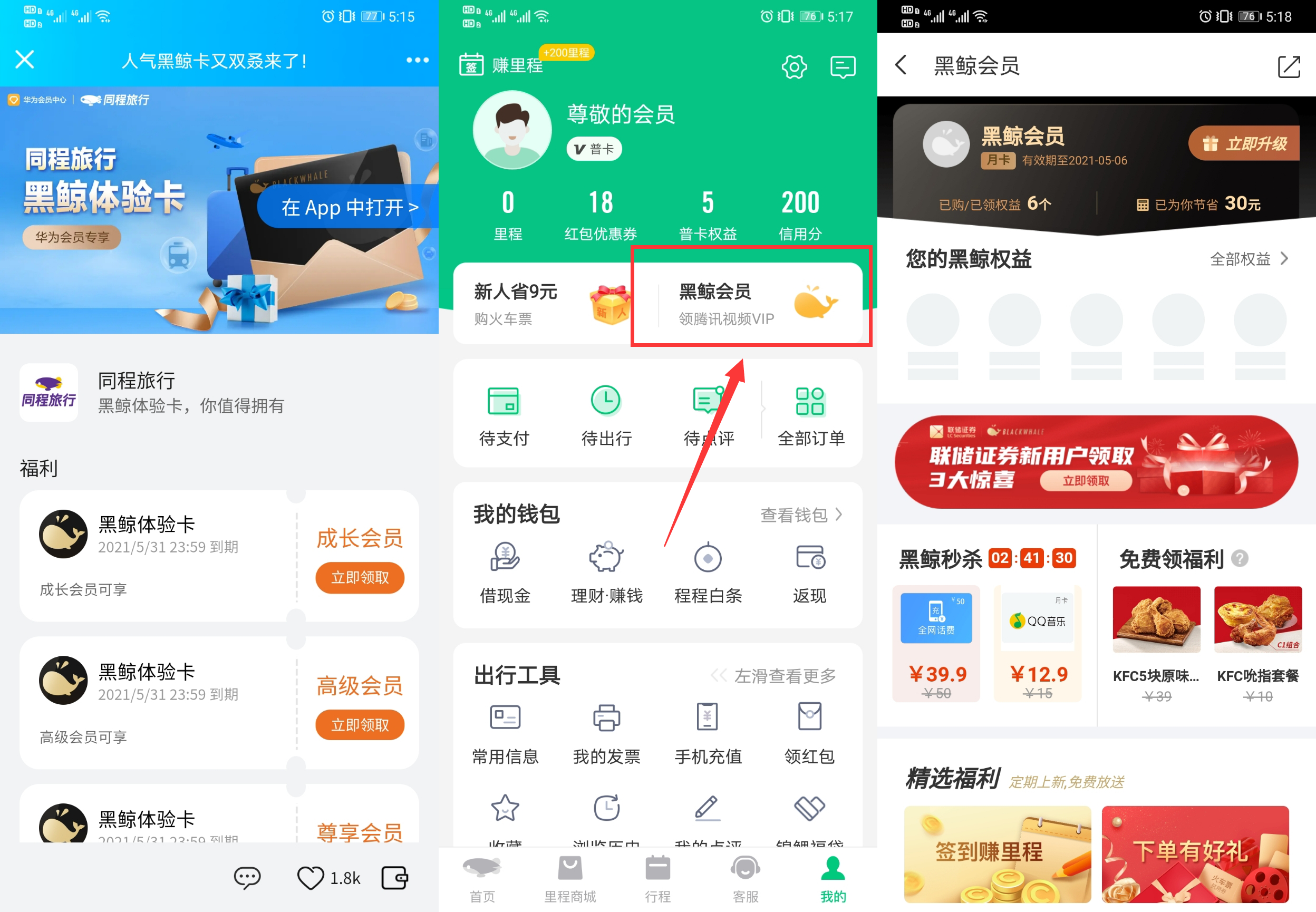 华为手机领取黑鲸体验会员 打开链接->跳转到华为会员中心领取!->领取之后打开“同程旅行”->黑金会员->开通->兑换码开通