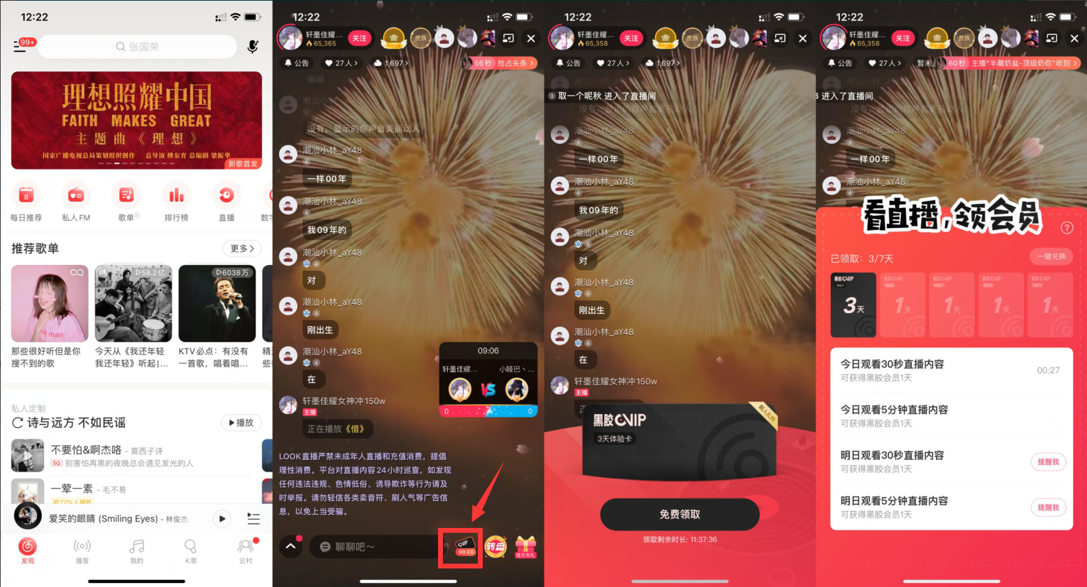 【网易云音乐领7天会员】打开网易云音乐APP->发现顶部->点直播->随便进个直播->右下角->黑胶VIP领取(没看见就换直播或换号)->每天观看几分钟领取