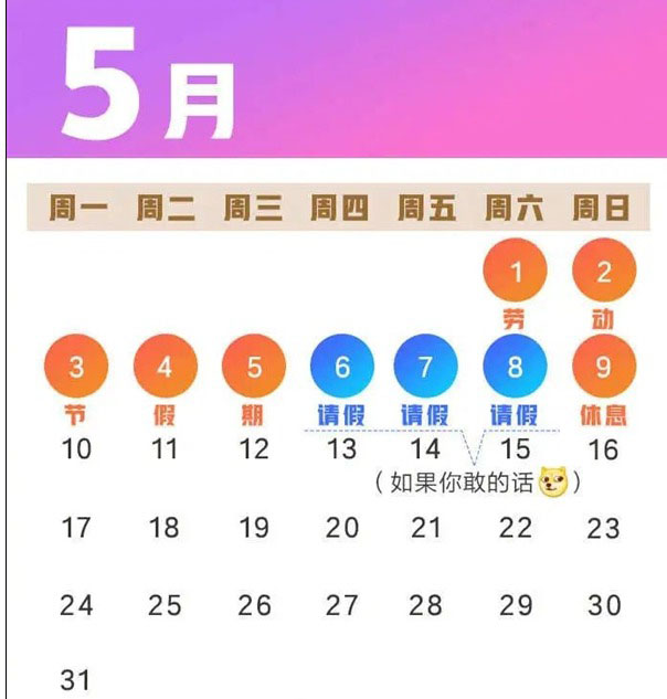 只要在5月6、7、8日请三天假,9天连休不是梦。