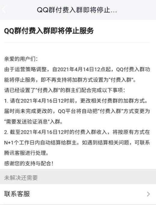 官方表示,由于运营策略调整,自2021年4月14日12点起,QQ付费入群功能将停止服务,之后将不再支持设置加群方式为“付费入群”。