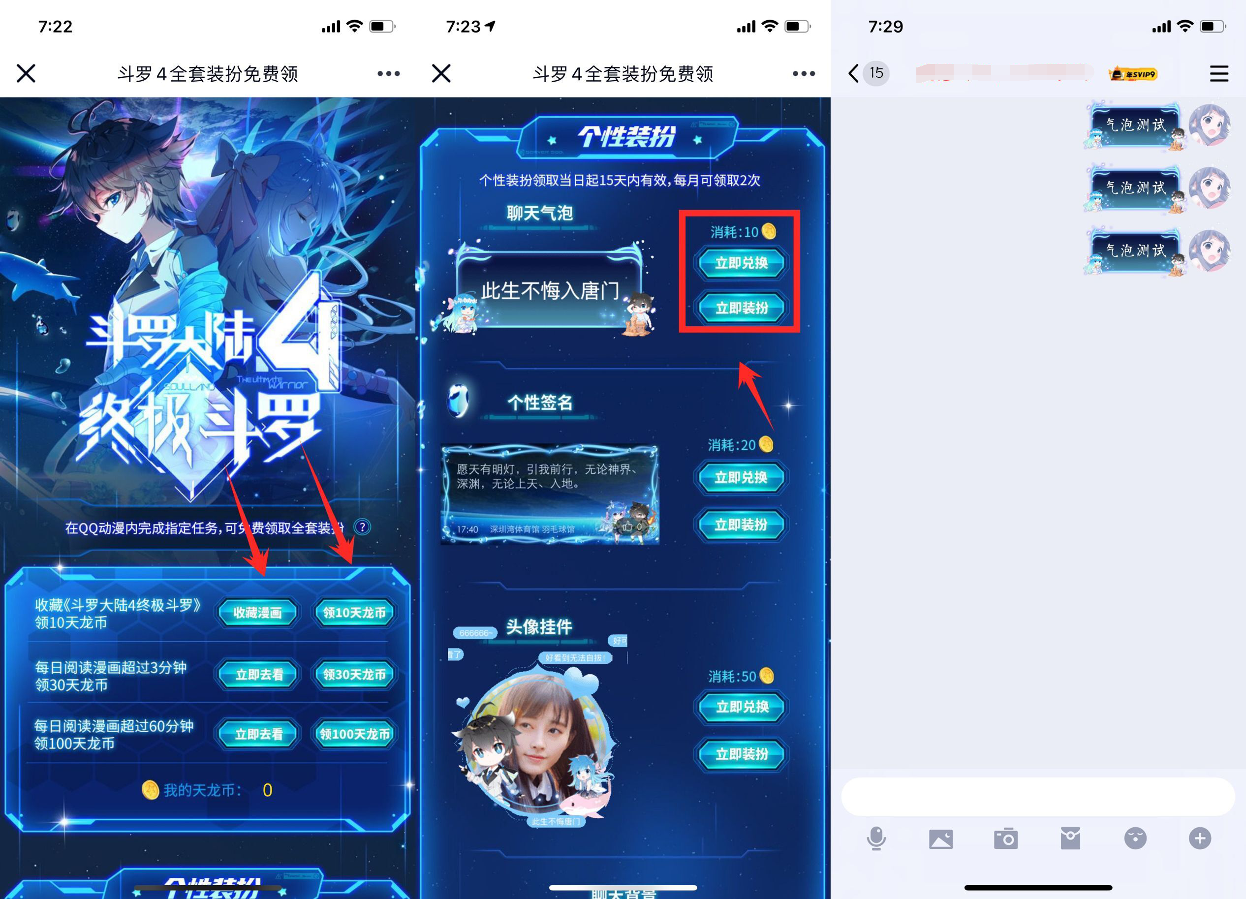 QQ最新斗罗大陆气泡装扮->打开下方活动链接->点击“收藏漫画”、“领10天龙币”->再下拉兑换气泡、装扮即可!