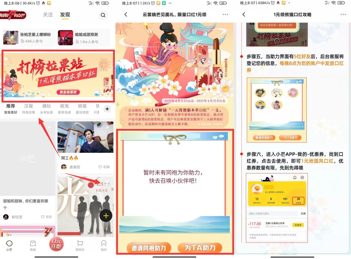 3、邀请5名新用户助力即可,1元购买口红一支包邮