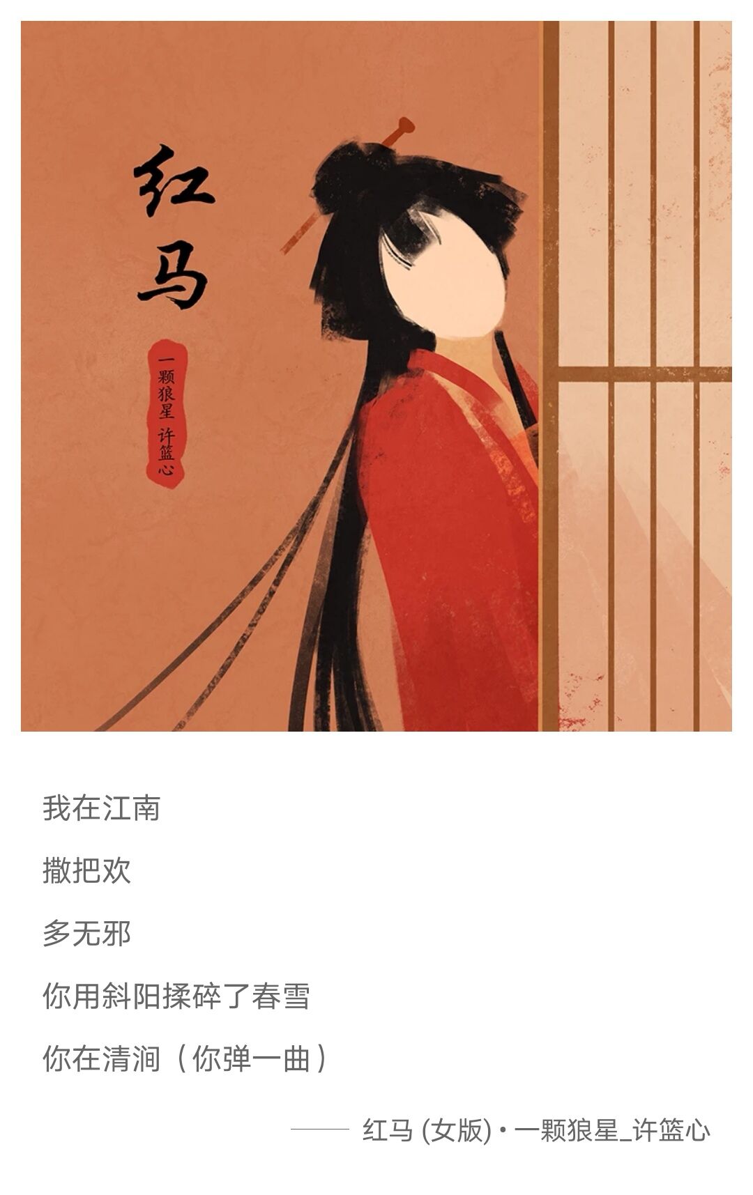 『单曲推荐』红马/一颗狼星_许篮心 旋律还有伴奏都很美妙,唱歌的也很有技巧,代入感很强。 我觉得唱歌有点虚,就是给人不是很实在的感觉,可以来些英气,青年气,朝气昂扬。 我觉得透露出来的感觉:悠闲自在,自信,才气。 这首歌很好听。