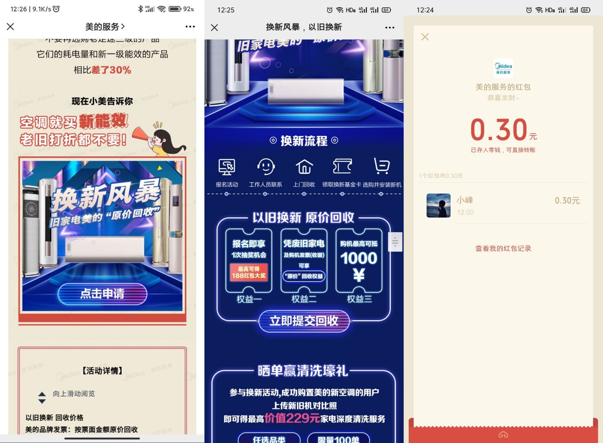 美的新一期->下拉点图->名字条形码乱填->图片乱传提交抽非必中!亲测0.30元微信红包!